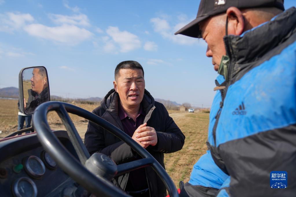 2月15日,山東省威海市文登區金農會(huì )農業(yè)專(zhuān)業(yè)合作社負責人于進(jìn)海和農機手討論施肥方案。