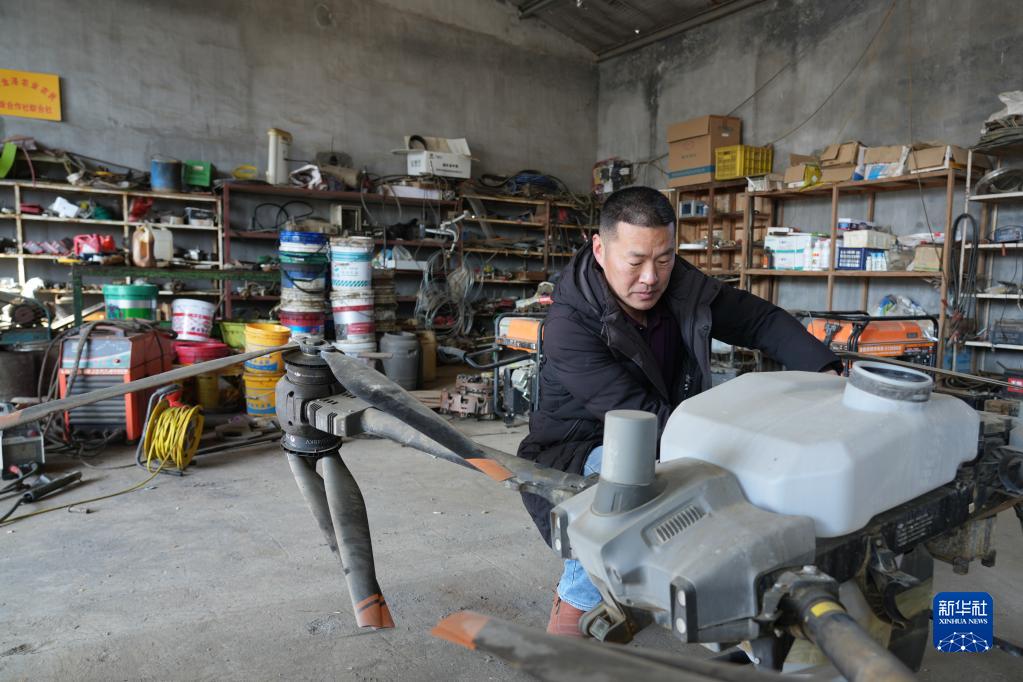 2月15日,山東省威海市文登區金農會(huì )農業(yè)專(zhuān)業(yè)合作社負責人于進(jìn)海在檢修農業(yè)無(wú)人機。
