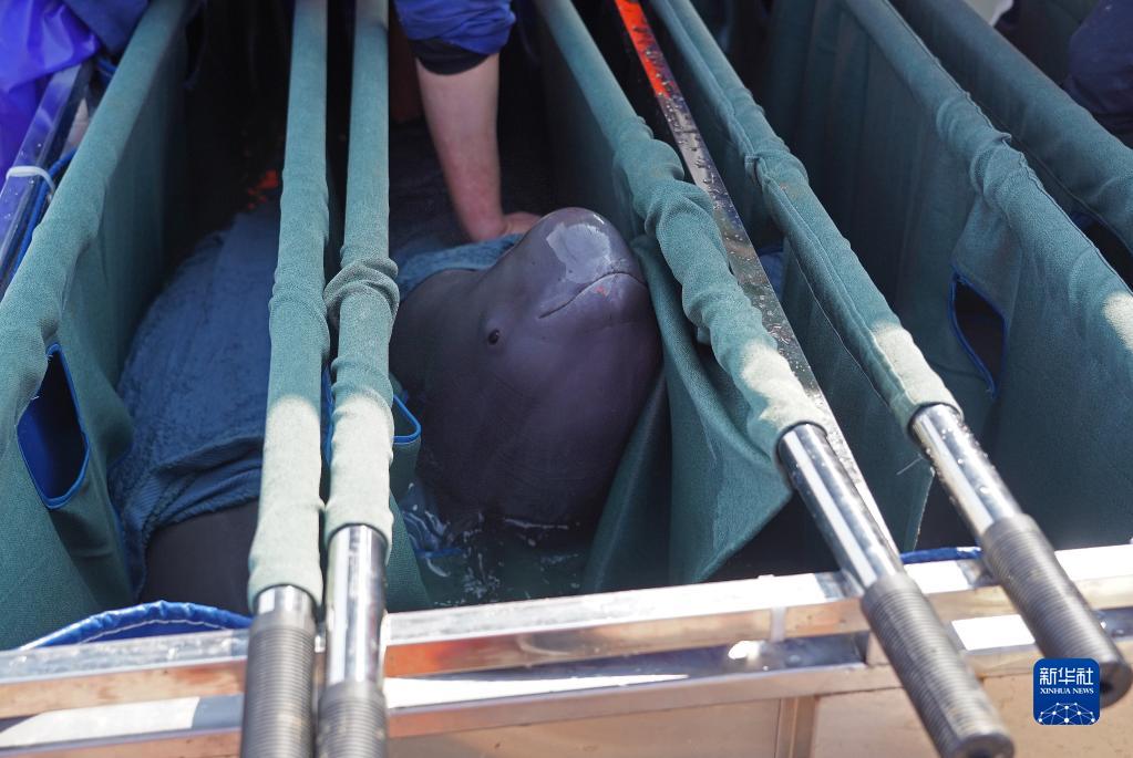 在江西鄱陽(yáng)湖松門(mén)山水域,一頭準備遷至江西湖口的江豚從水箱里探出頭來(lái)(2月15日攝)。