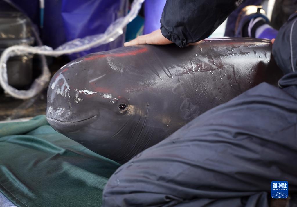 在江西鄱陽(yáng)湖松門(mén)山水域,科研人員一邊為江豚體檢,一邊用手安撫(2月15日攝)。