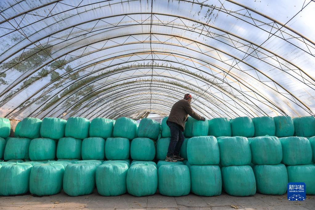 2月16日,在吉林省長(cháng)春市九臺區東湖街道腰站村,隆達興養殖農民專(zhuān)業(yè)合作社農民整理玉米秸稈壓縮包。