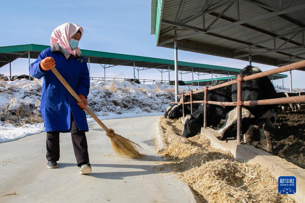 在古浪縣西靖鎮肉牛養殖基地,工作人員打掃牛棚衛生(2月15日攝)。