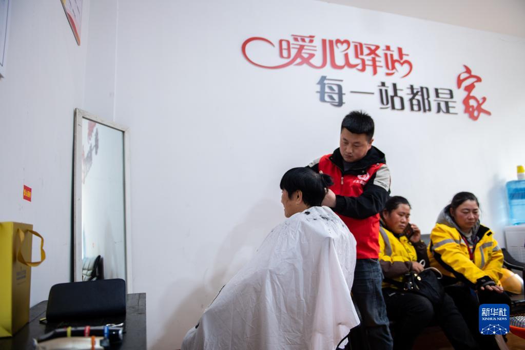 2月16日,在汨羅市歸義鎮友誼河社區“暖心驛站”,志愿者為戶(hù)外勞動(dòng)者義務(wù)剪發(fā)。