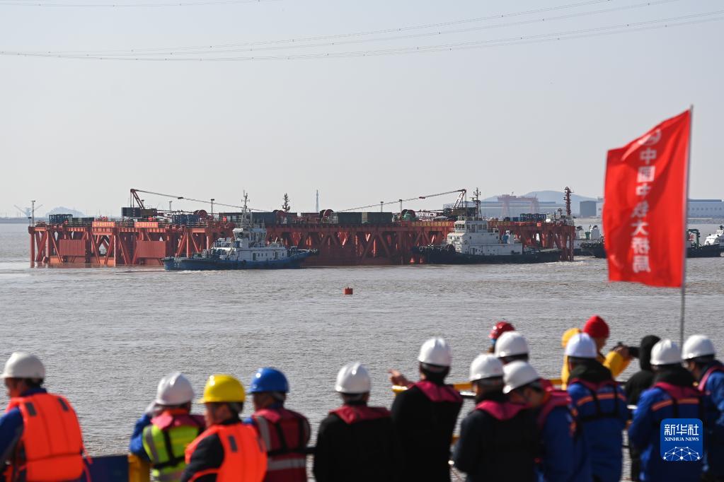 2月16日,中鐵大橋局技術(shù)人員在關(guān)注甬舟鐵路西堠門(mén)公鐵大橋5號墩自浮式鉆孔平臺浮運的位置。