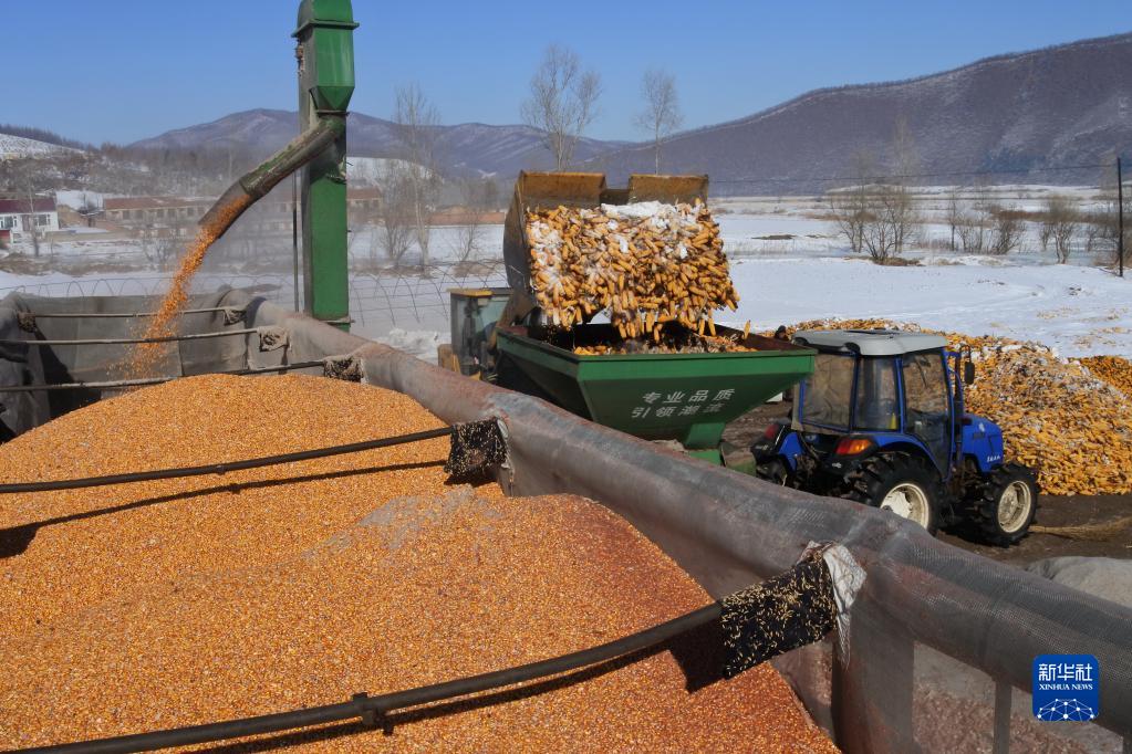 2月15日,在黑龍江省牡丹江市林口縣刁翎鎮三家子村,農民利用設備將玉米脫粒,為春耕做準備。
