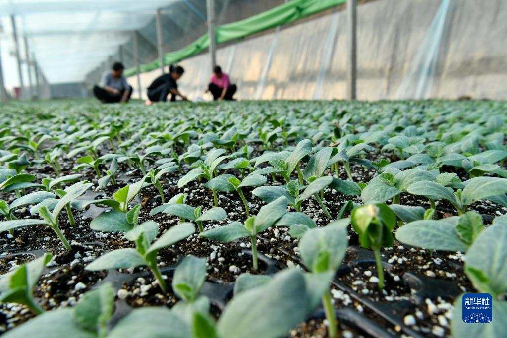 2月16日,地處獻縣泛區的河北省滄州市獻縣臨河鄉趙三角村村民在村內一處育苗基地內打理秧苗。