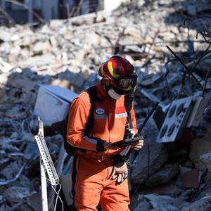 2月9日,中國救援隊隊員在土耳其哈塔伊省安塔基亞市開(kāi)展救援工作。