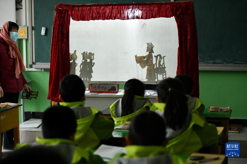 2月17日,河北省獻縣段村鎮中心小學(xué)的孩子們在觀(guān)看張維宗表演皮影戲。