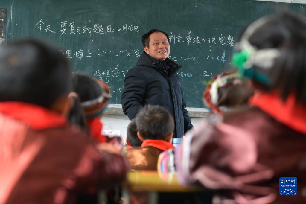 2月16日,貴州省從江縣西山鎮中寨教學(xué)點(diǎn)教師孟榮達給學(xué)生上課。