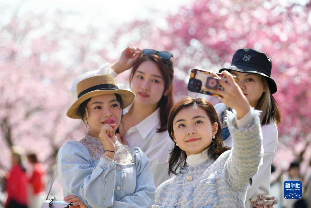 2月17日,在漳平市永福鎮的臺品櫻花茶園,游客在櫻花樹(shù)下合影留念。