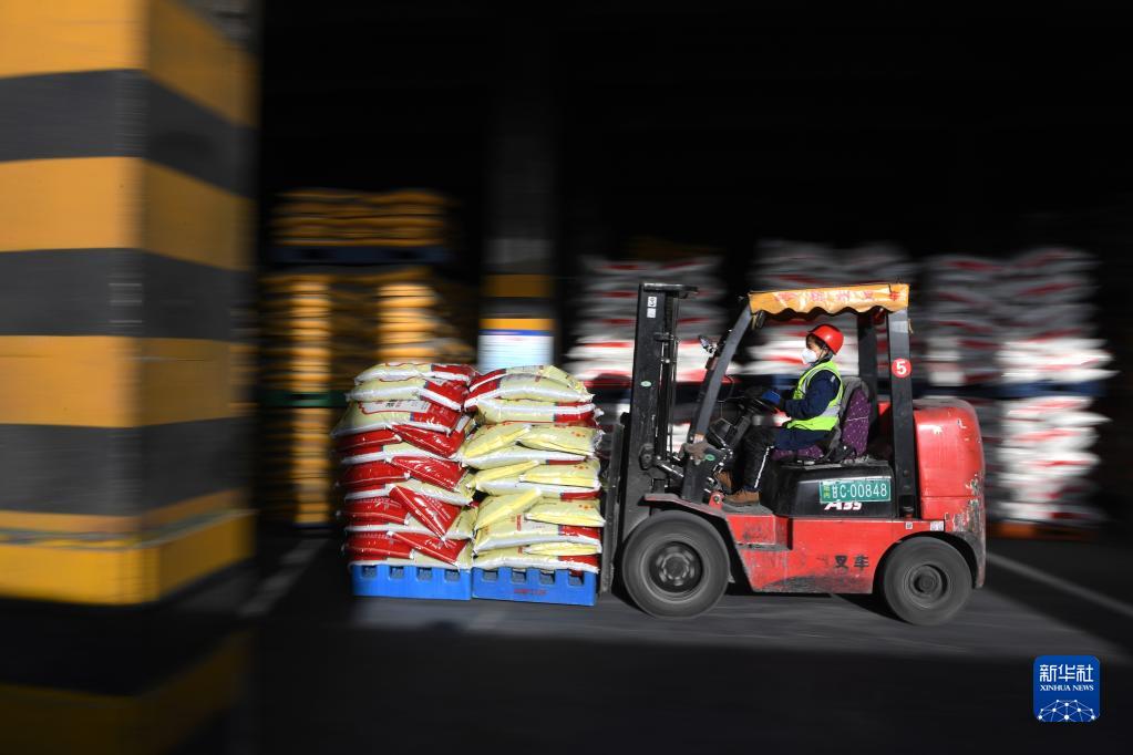 2月17日,在甘肅省金昌市一企業(yè)鐵路專(zhuān)用線(xiàn)上,工作人員駕駛叉車(chē)準備將化肥裝車(chē)。