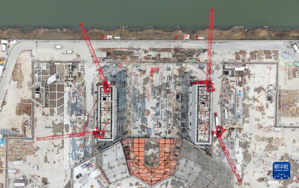 2月17日拍攝的建設中的中建二局臨港西島中銀金融中心項目南北塔樓核心筒,與智能造樓機配套的四座紅色動(dòng)力臂引人注目(無(wú)人機照片)。