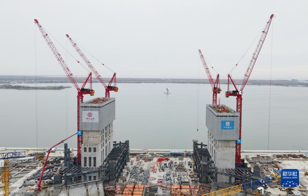 2月17日拍攝的建設中的中建二局臨港西島中銀金融中心項目南北塔樓核心筒,與智能造樓機配套的四座紅色動(dòng)力臂引人注目(無(wú)人機照片)。
