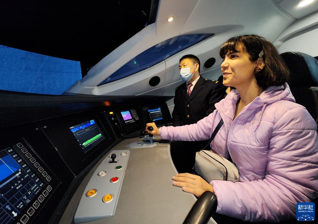 2月17日,在西鐵教育培訓基地,西安交通大學(xué)的伊朗留學(xué)生(前)在機務(wù)全功能高級模駕區體驗中國高鐵模擬駕駛。