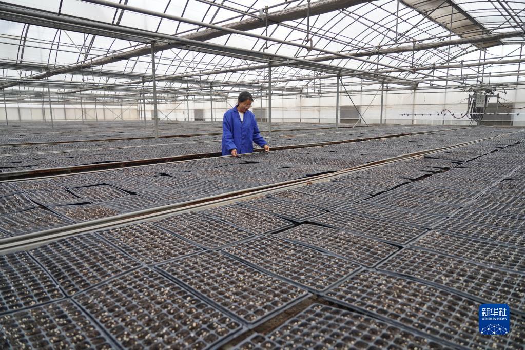 2月17日,張莎莎在連棟育苗溫室內查看秧苗長(cháng)勢。