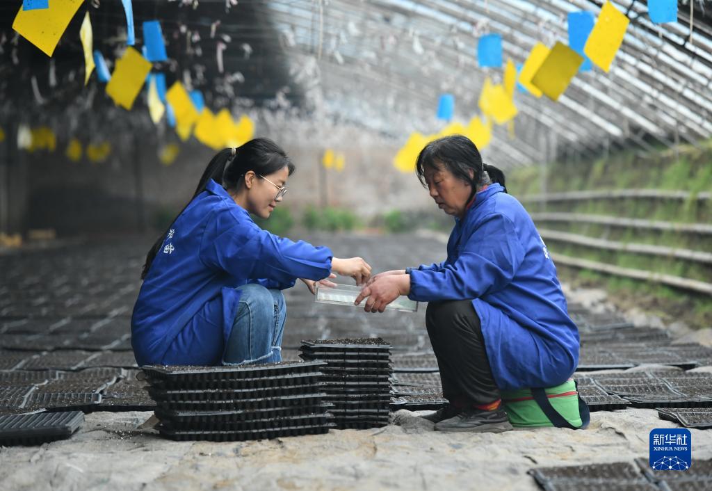 2月17日,張莎莎(左)在育苗棚內進(jìn)行播種工作。