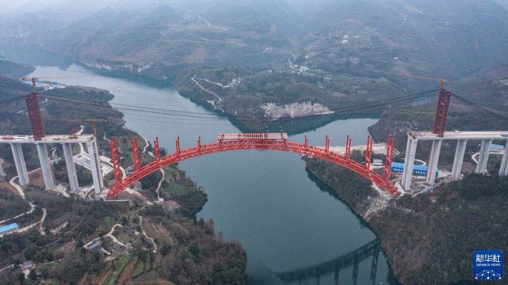正在進(jìn)行橋面系施工的德余高速烏江特大橋(2月16日攝,無(wú)人機照片)。