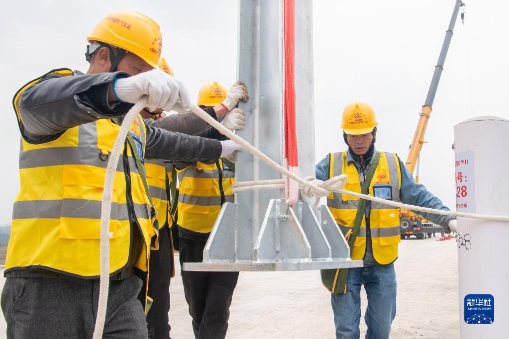 2月18日,在位于重慶市永川區的渝昆高鐵施工現場(chǎng),施工人員架設接觸網(wǎng)桿。