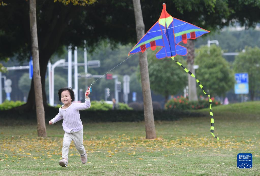 2月18日,一名小朋友在廣西南寧市南湖邊放風(fēng)箏。