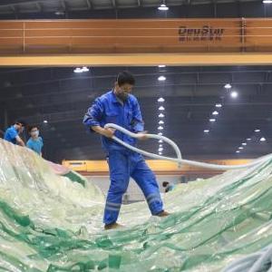 2月17日,在酒泉經(jīng)濟技術(shù)開(kāi)發(fā)區的一家風(fēng)電葉片制造企業(yè),工人在風(fēng)機葉片生產(chǎn)線(xiàn)為葉片灌注做準備。