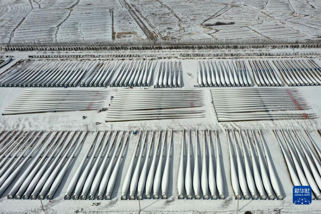 這是2月18日在武威市涼州區一家風(fēng)電裝備生產(chǎn)企業(yè)拍攝的風(fēng)機葉片成品(無(wú)人機照片)。