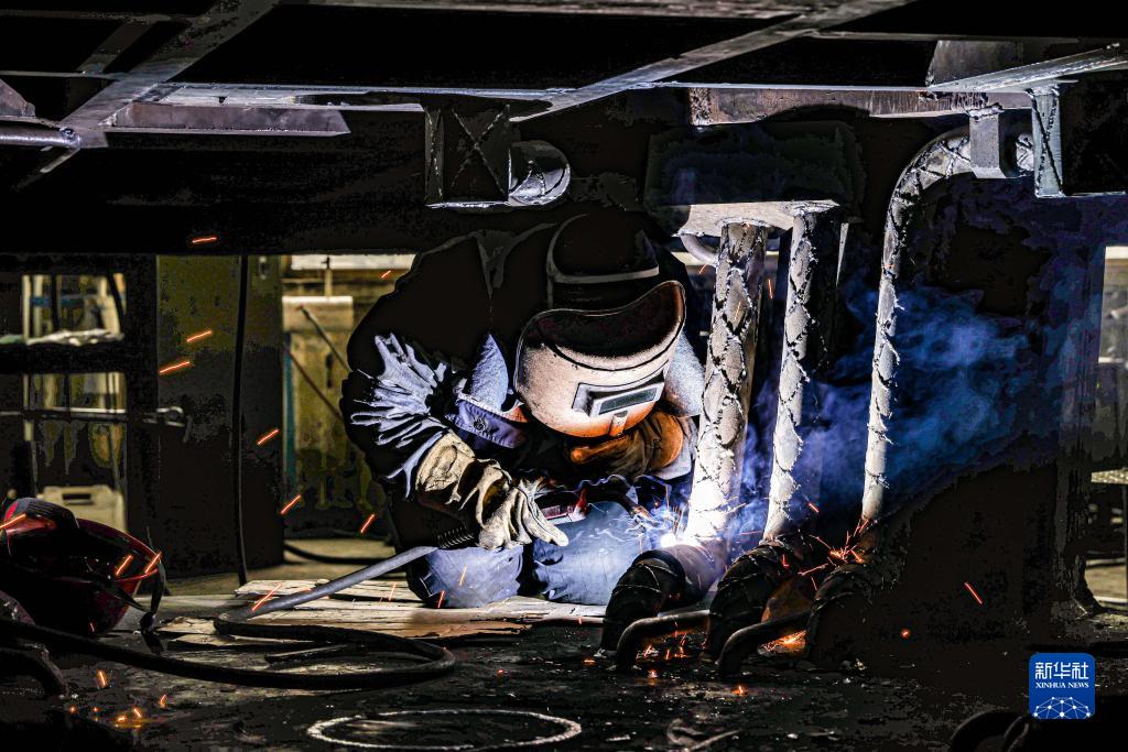 工人在位于遼寧省沈陽(yáng)市的北方重工有限公司車(chē)間焊接零部件(1月13日攝)。