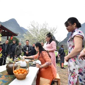 2月18日,在廣西融安縣東起鄉銅板屯李花節活動(dòng)中,銅板屯、桂黔烏英苗寨的村民一起吹蘆笙。