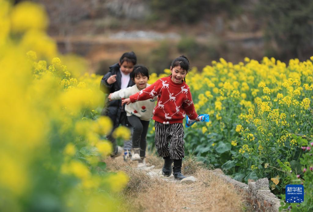 2月19日,小朋友在貴州省從江縣洛香鎮上皮林村的油菜花田間玩耍。