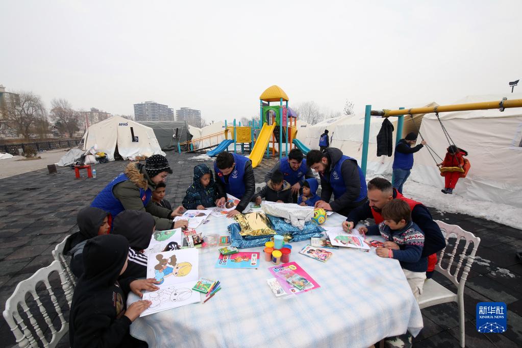 2月19日,在土耳其南部卡赫拉曼馬拉什省卡赫拉曼馬拉什市,工作人員在居民安置點(diǎn)陪伴少年兒童。