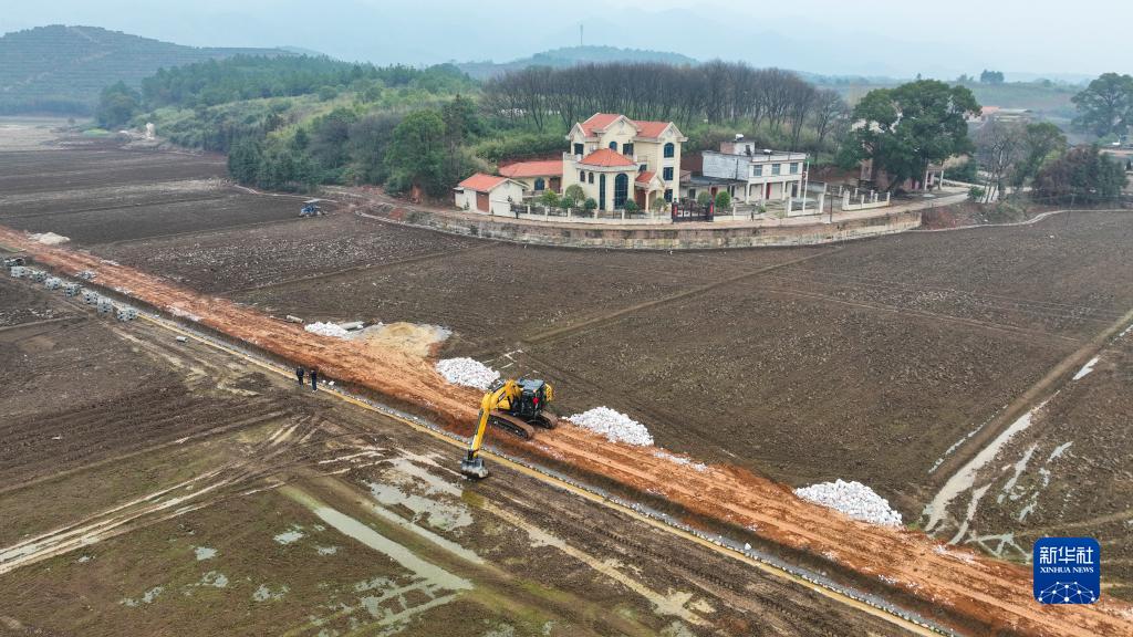 2月19日,施工人員在常寧市三角塘鎮塘沖村高標準農田建設現場(chǎng)修建排水渠(無(wú)人機照片)。