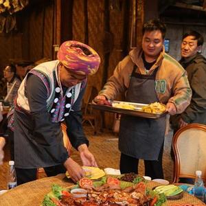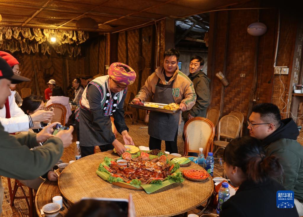 2月19日,游客在福貢縣匹河怒族鄉老姆登村一家客棧體驗手抓飯。
