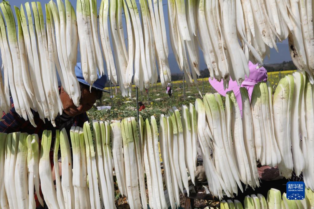2月19日,云南省騰沖市界頭鎮沙壩村農民在農田里采收晾曬蘿卜。