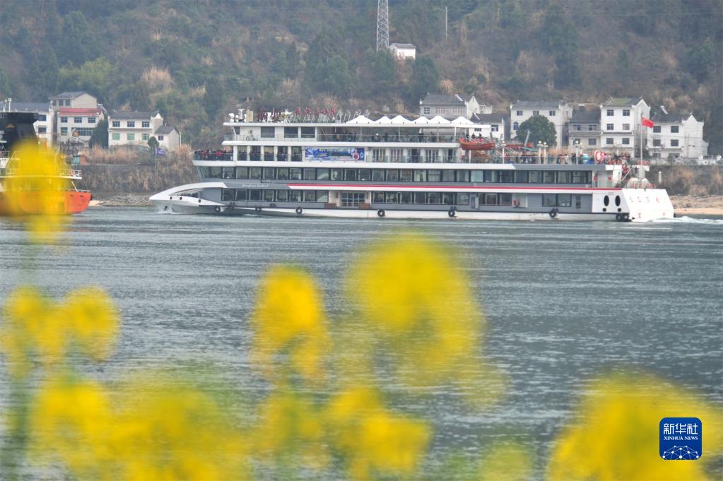 “長(cháng)江三峽8號”游船在湖北省宜昌市夷陵區樂(lè )天溪段水域載著(zhù)游客觀(guān)光游覽(2月14日攝)。