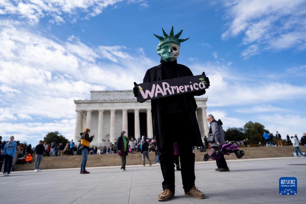 2月19日,在美國首都華盛頓,一名抗議者手舉標語(yǔ)在林肯紀念堂前參加集會(huì )。