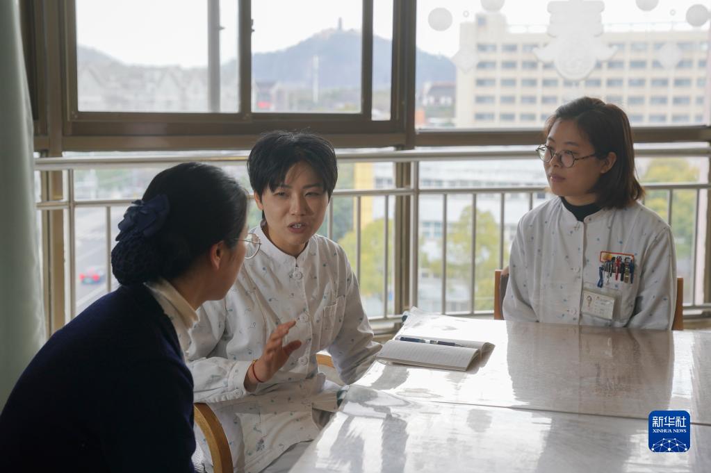 2月14日,在南通常青樂(lè )齡護理院,李楠楠(中)聽(tīng)取同事建議。