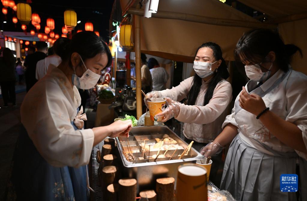 攤主在??谌赵聫V場(chǎng)的古風(fēng)市集售賣(mài)小吃(2月19日攝)。