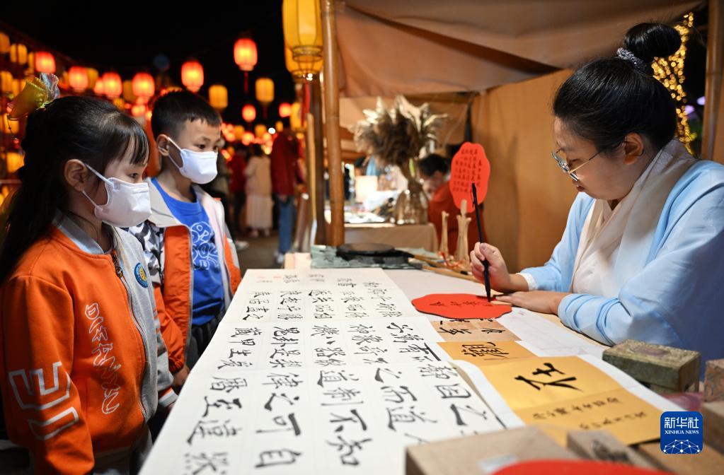 小朋友在??谌赵聫V場(chǎng)的古風(fēng)市集觀(guān)看攤主展示書(shū)法技藝(2月19日攝)。