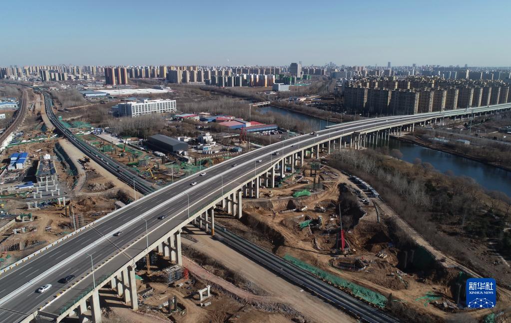 2月20日,中交路橋建設有限公司的工人在石家莊市新華區境內的北三環(huán)市政化改造項目建設工地施工(無(wú)人機照片)。