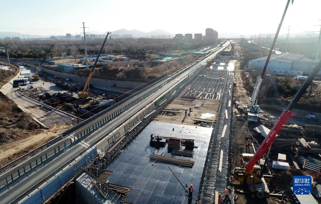 2月20日,中交路橋建設有限公司的工人在石家莊市新華區境內的北三環(huán)市政化改造項目建設工地施工(無(wú)人機照片)。