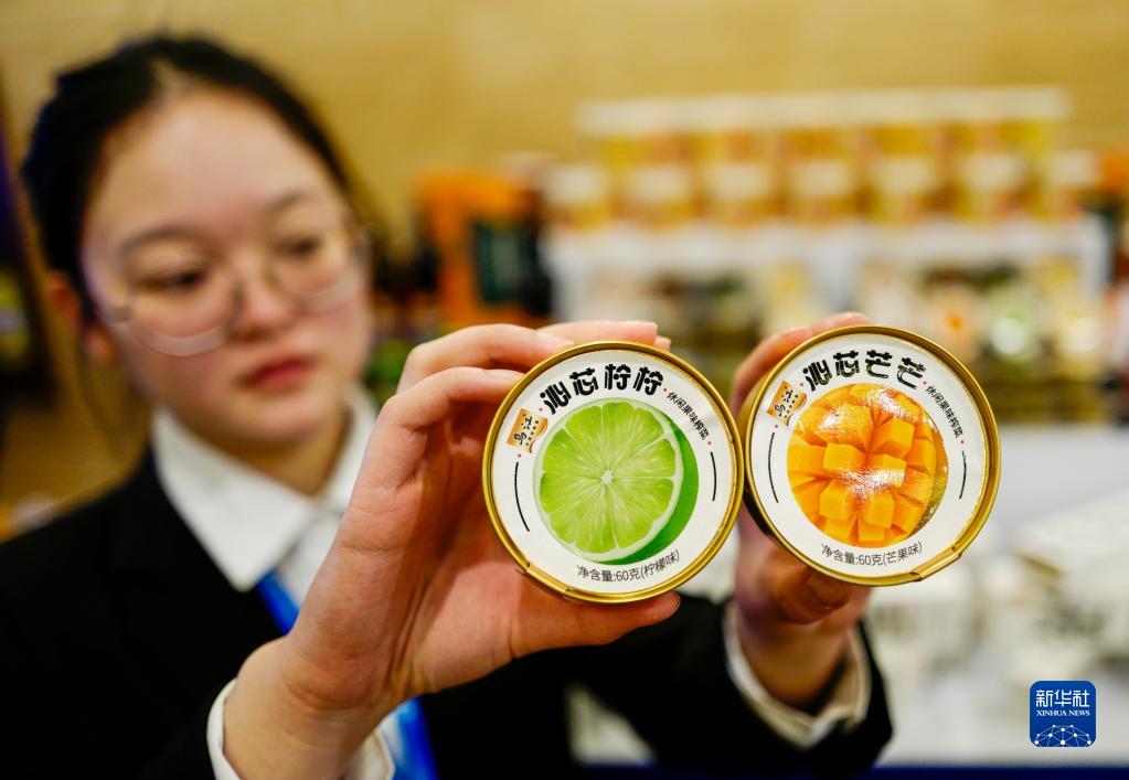 2月20日,在第五屆中國重慶·涪陵榨菜產(chǎn)業(yè)國際博覽會(huì )現場(chǎng),一家榨菜企業(yè)的工作人員展示水果口味的榨菜新產(chǎn)品。