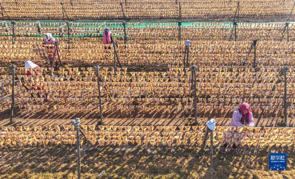 2月20日,在榮成市靖海灣畔一處晾曬場(chǎng),漁民在晾曬魷魚(yú)(無(wú)人機照片)。