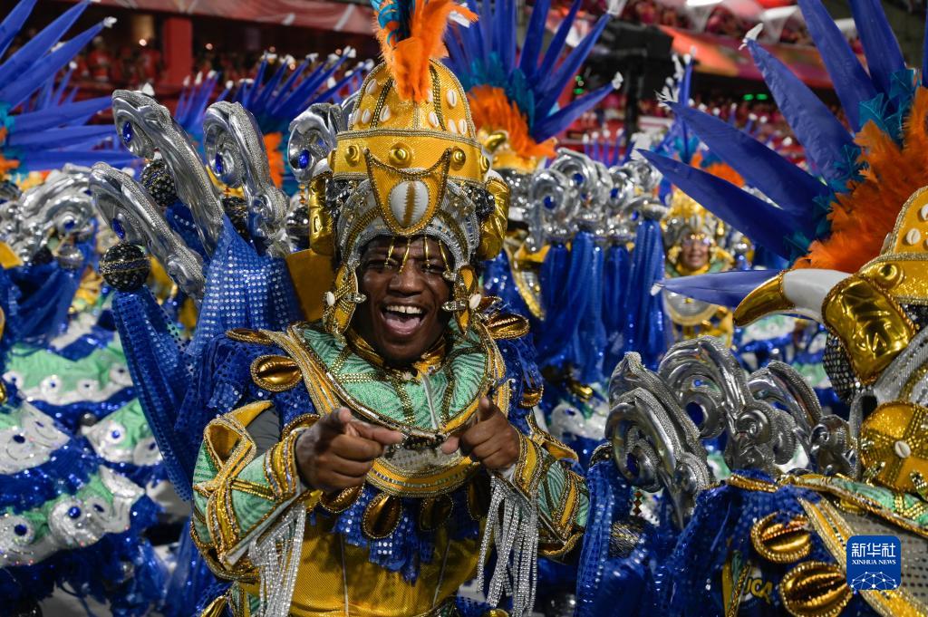 2月20日凌晨,在巴西里約熱內盧的桑巴大道,桑巴舞校演員參加狂歡節游行。