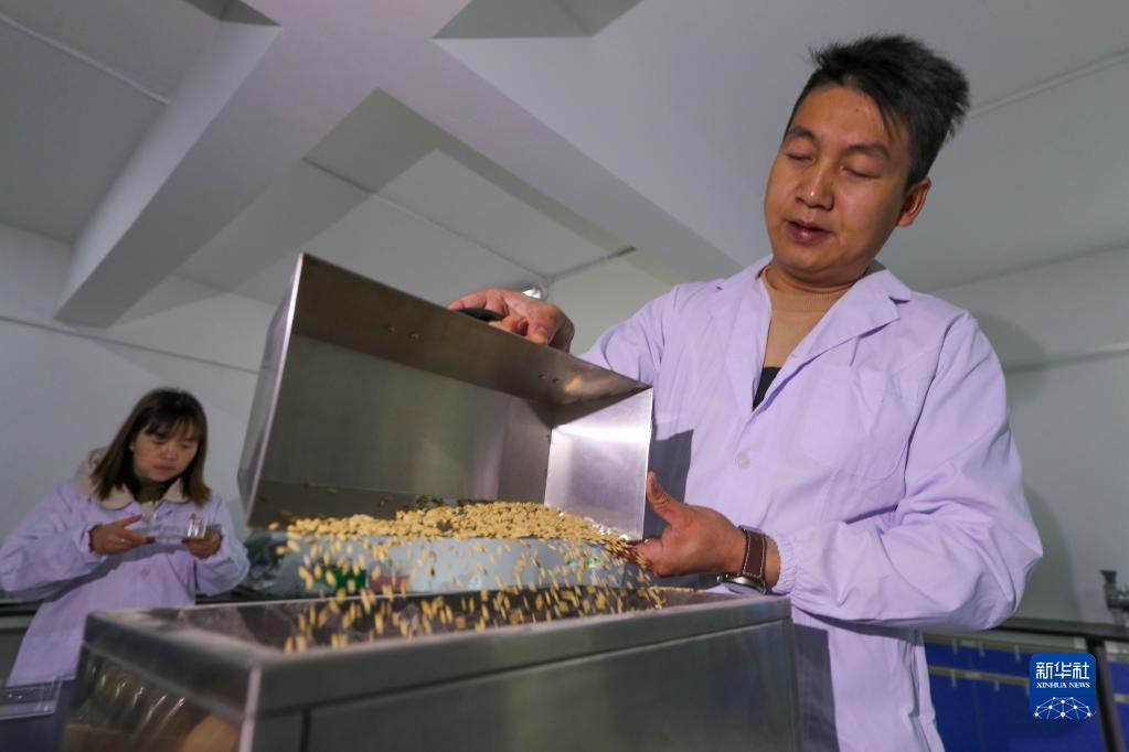 2月20日,技術(shù)員在貴州省黔東南苗族侗族自治州岑鞏縣一家雜交水稻制種公司檢測種子的發(fā)芽率。