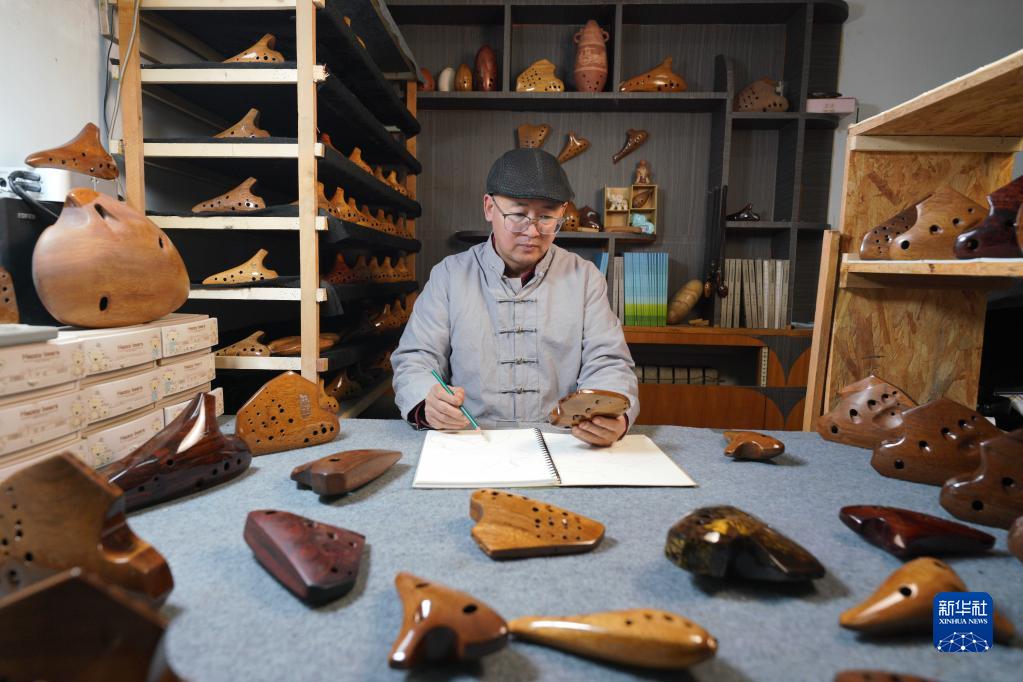 2月20日,陶笛藝人侯義敏在設計木質(zhì)陶笛。