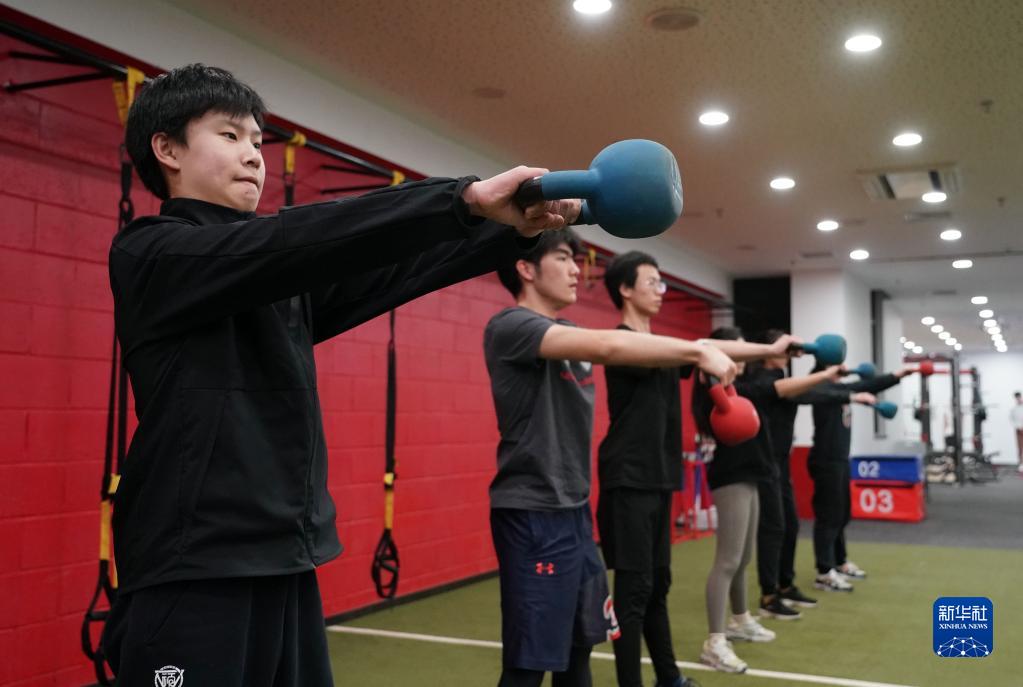 2月20日,在北京大學(xué)附屬中學(xué),學(xué)生在體育課中進(jìn)行壺鈴挺身練習。