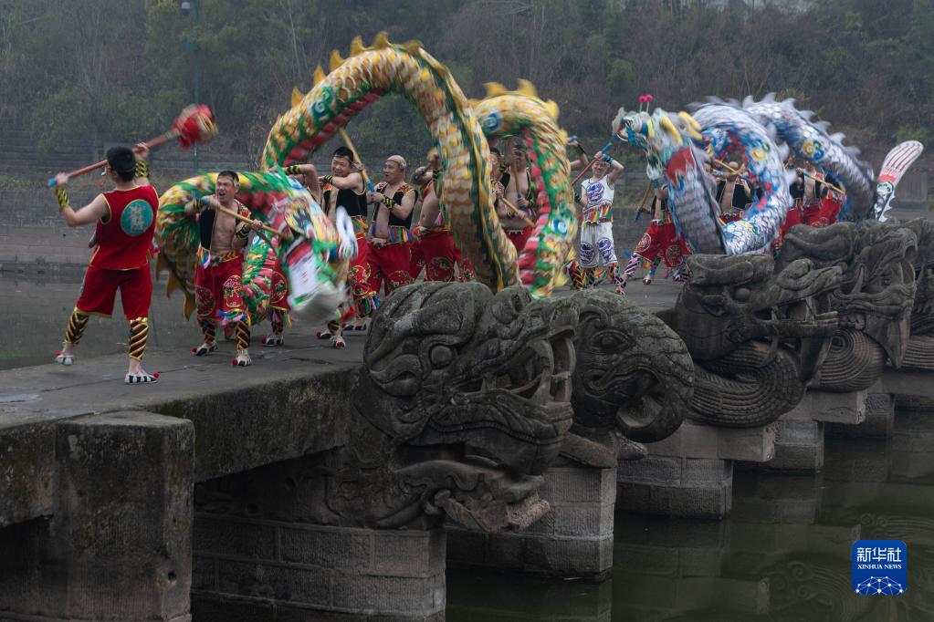 2月21日,在全國重點(diǎn)文物保護單位——瀘縣龍腦橋上,國家級非物質(zhì)文化遺產(chǎn)“雨壇彩龍”正在表演中。