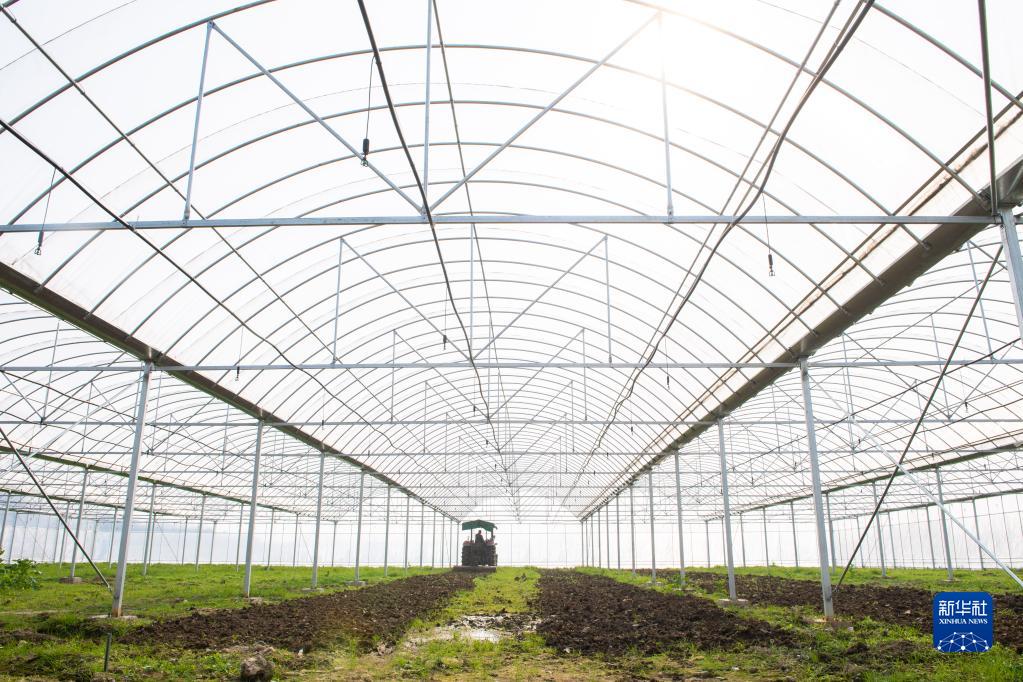 2月21日,在醴陵市沈潭鎮龐龍村,村民駕駛農機在新修建的育秧大棚內翻土備耕。