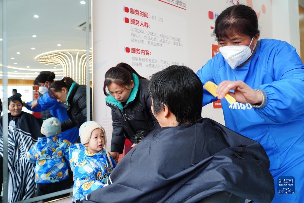2月21日,在山東省成武縣文亭街道中國院子小區,理發(fā)師李建華為小區居民理發(fā)。