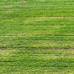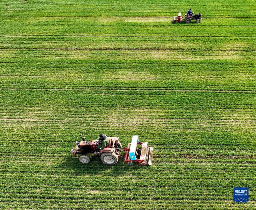2月21日,在安徽省亳州市譙城區十河鎮位李村,農民給麥田施肥(無(wú)人機照片)。