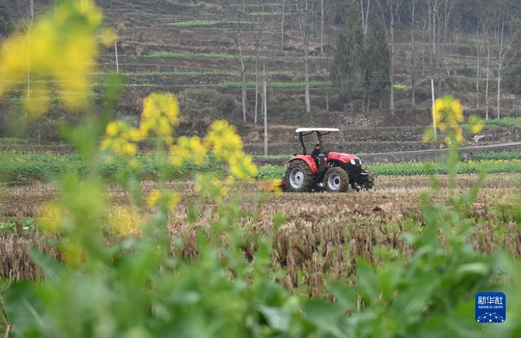2月21日,在貴州省銅仁市松桃苗族自治縣甘龍鎮麻兔村,農民駕駛拖拉機翻耕土地。